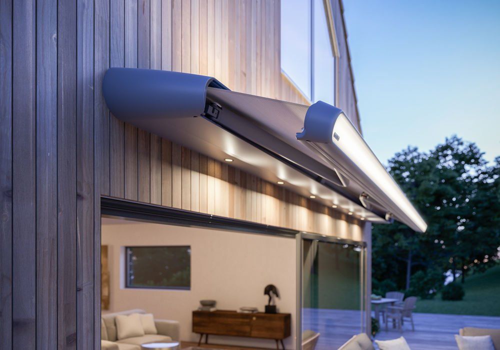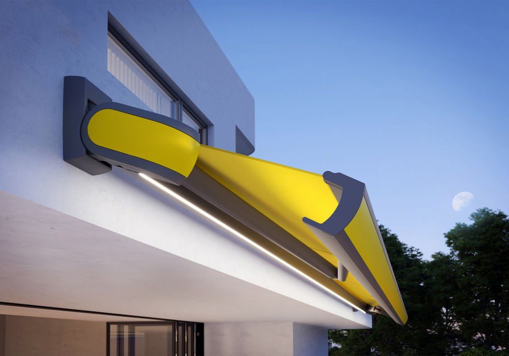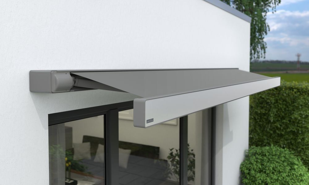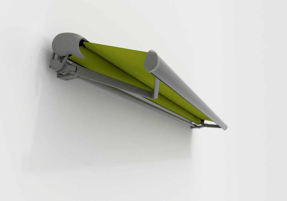 Open awning installations do without a cassette entirely. The mechanics and fabric roller are openly accessible, visible, and create colour accents.