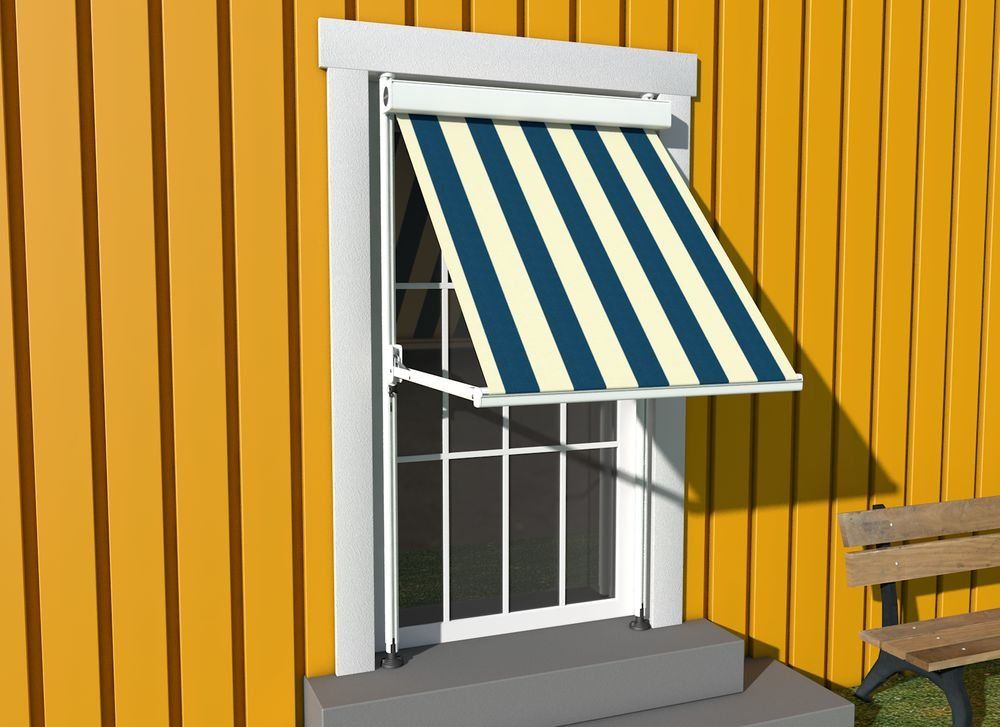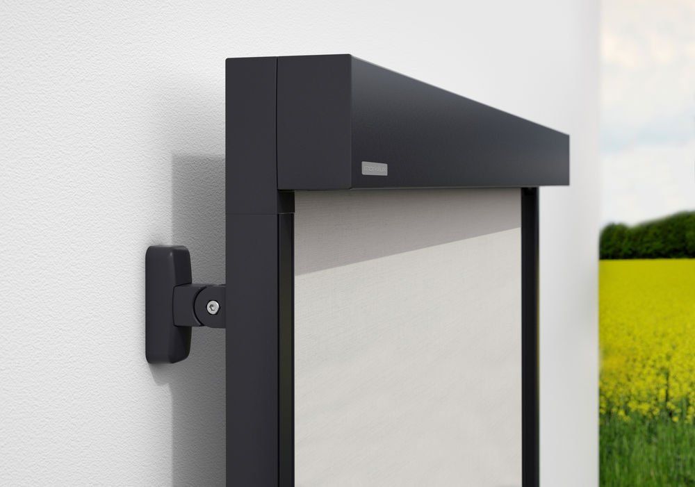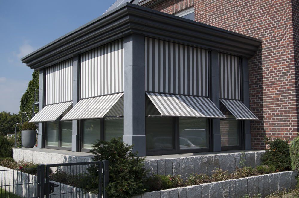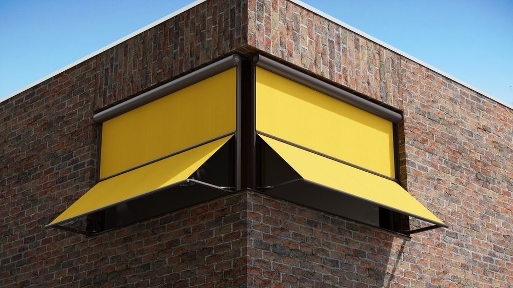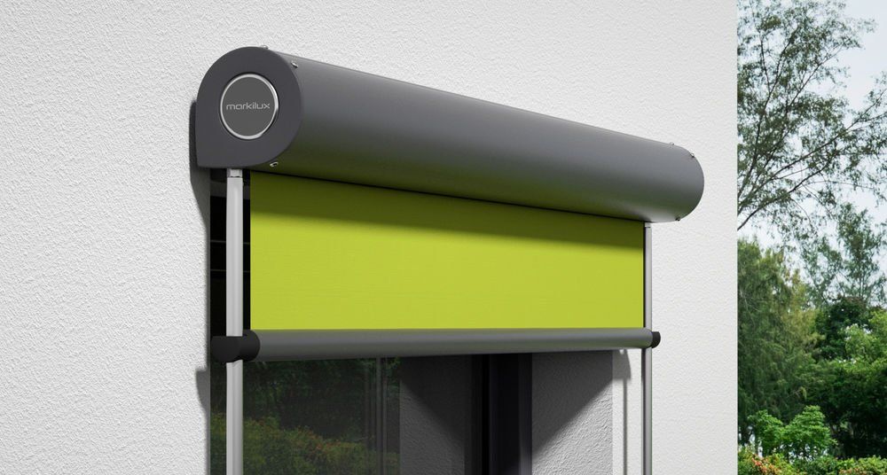 Marquisolette with a square cassette, angled guide rails and cloth tension by means of gas spring technology – for areas of up to 9m2.
