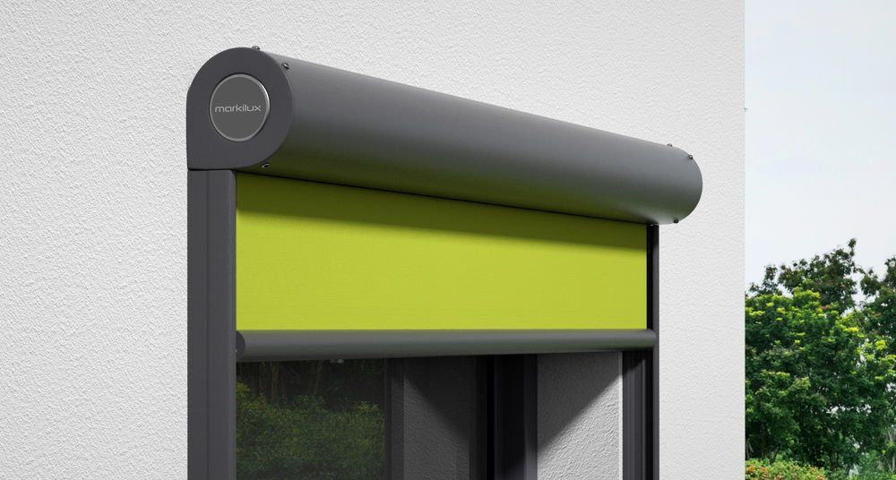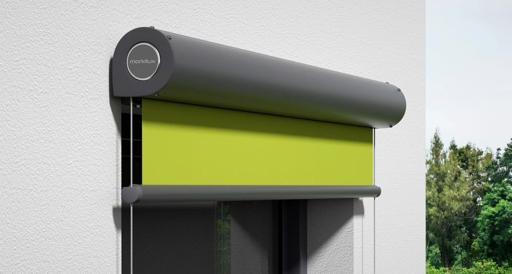 Marquisolette with a round cassette, angled guide rails and cloth tension by means of gas spring technology – for areas of up to 9m2.